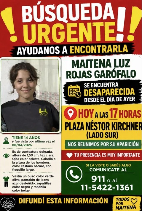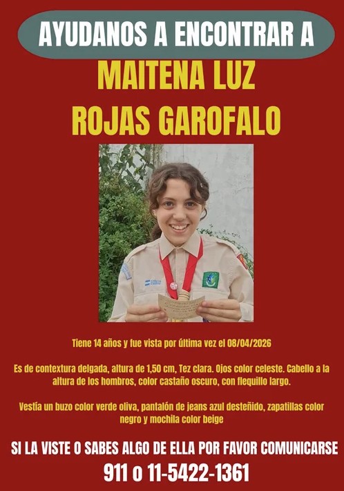 Desesperada búsqueda en la localidad bonaerense de Merlo de la adolescente Maitena Garófalo, quien fue vista por última vez este miércoles a la mañana cuando se despidió de su hermana en la puerta de la Escuela N° 16. La familia informó que la menor dejó el celular en su casa y se llevó dinero en efectivo y la tarjeta SUBE.